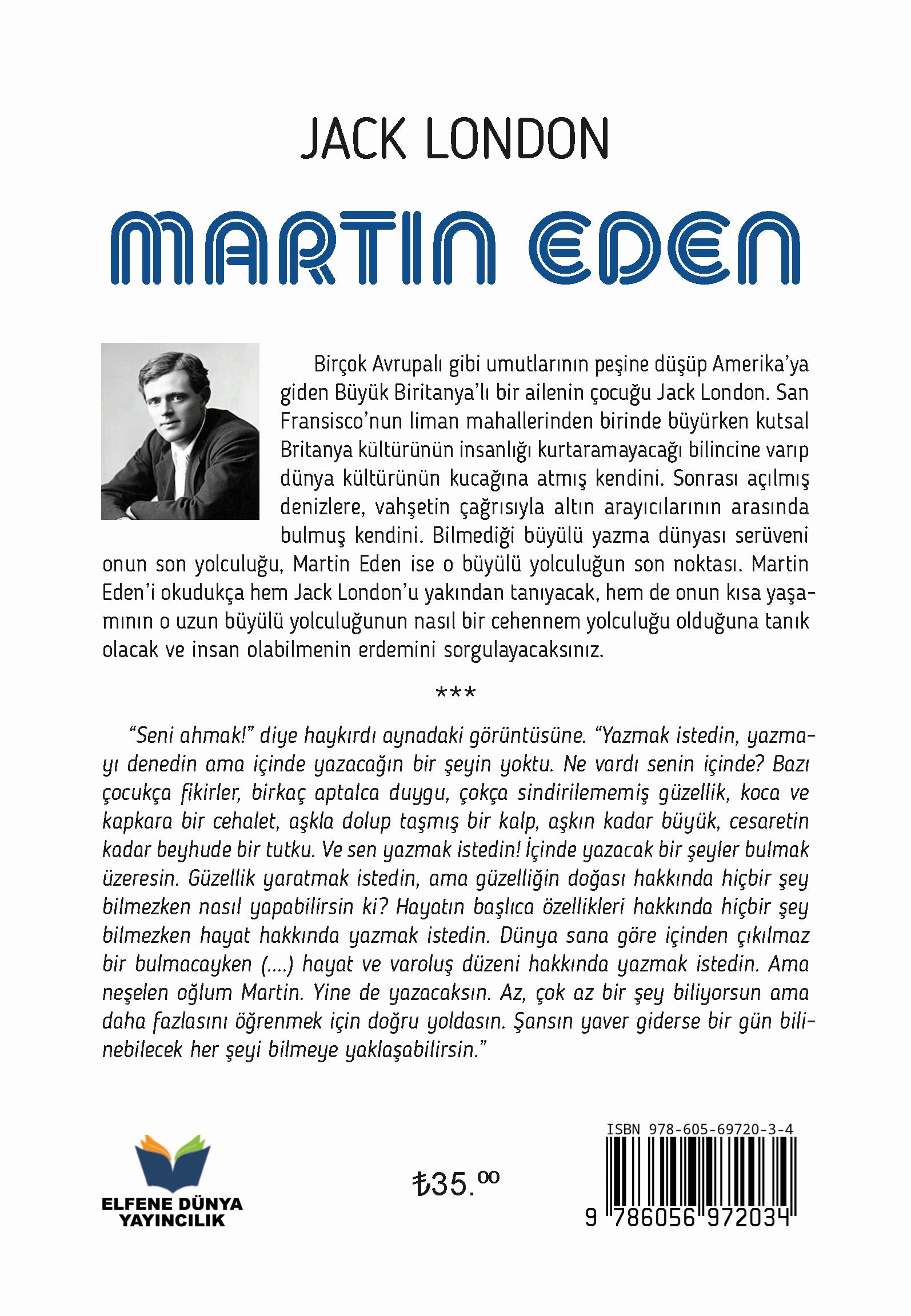 San Fransisco’nun liman mahallerinden birinde büyürken kutsal Britanya kültürünün insanlığı kurtaramayacağı bilincine varıp dünya kültürünün kucağına atmış kendini. Sonrası açılmış denizlere, vahşetin çağrısıyla altın arayıcılarının arasında bulmuş kendini. Bilmediği büyülü yazma dünyası serüveni onun son yolculuğu, Martin Eden ise o büyülü yolculuğun son noktası. Martin Eden’i okudukça hem Jack London’u yakından tanıyacak, hem de onun kısa yaşamının o uzun büyülü yolculuğunun nasıl bir cehennem yolculuğu olduğuna tanık olacak ve insan olabilmenin erdemini sorgulayacaksınız.